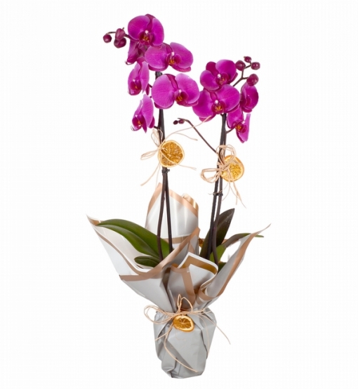 55 Cm yüksekliğinde çift dallı mor phalanopsiz orkide bitkisi. Not; Orkide bitkisi, mevsim şartları ve yapısı gereği çiçek veya tomurcuk adetlerinde değişkenlik göstermektedir. Orkidenin rengi stok durumuna göre ton farklılığı göstermektedir.