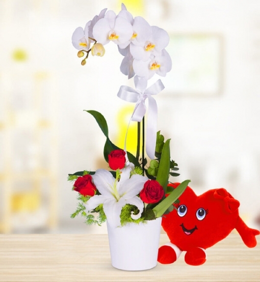 Lilyum zarafeti, beyaz orkide kendine güveni simgeler. Mağrur ve kendine güvenen görünüşüyle, kırmızı gül ve bir adet lilyumdan oluşan aranjmana kalp yastığın sempatikliği eşlik ediyor. Not; Lilyumlar, mevsimsel şartlar nedeniyle kapalı olarak gönderilebilir. Kapalı lilyumlar oda sıcaklığında ve 1-2 gün içerisinde açmaktadır.