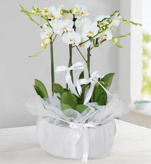 1. Sınıf ithal beyaz orkideler kullanılmıştır. Çiçeğin yüksekliği yaklaşık 60 cm dir.