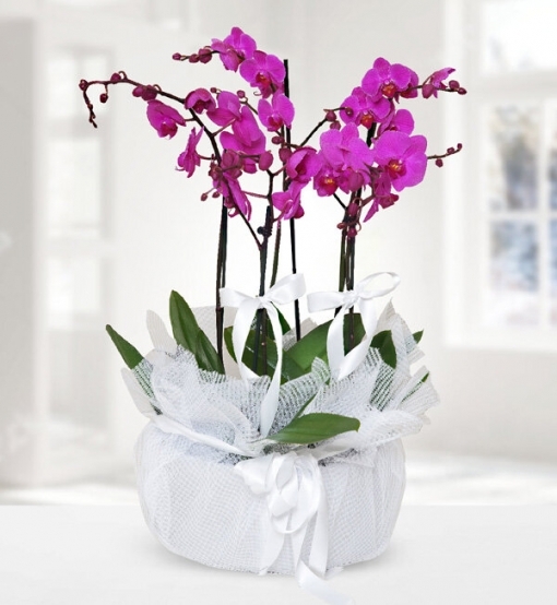 1. Sınıf ithal mor orkideler kullanılmıştır. Çiçeğin yüksekliği yaklaşık 60 cm dir.