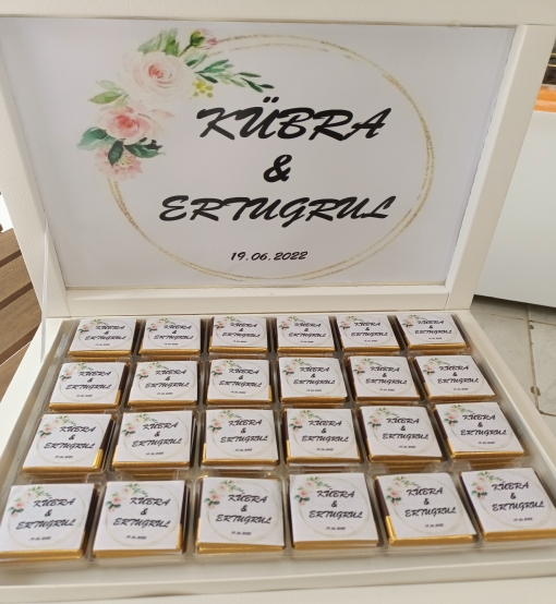 İstediğiniz desen ve yazıyı Çikolataya ve kutuya ekleyebilirsiniz