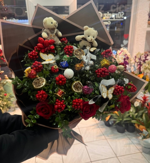 Büyük boy kokina buketi,Kokinalar,Çikolata,Ayıcık,Yılbaşı süsleri,Şekerler ve ek ürünlerden oluşan Kokina Buketi.