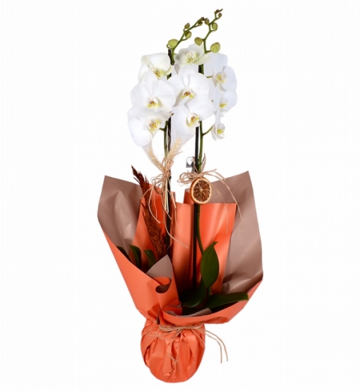 Turuncu Buket Kağıtlı Saksıda Çift Dallı Beyaz Orkide