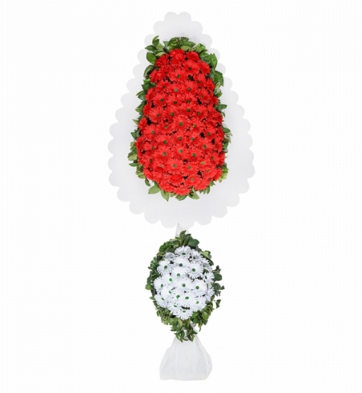Kırmızı ve beyaz yapay gerberalar ile hazırlanmış çift katlı ayaklı nikah, açılış ve düğün çelengi.