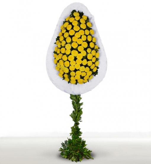 Sarı cinya ve yeşillikler ile hazırlanmış ayaklı nikah, açılış ve düğün çiçeği.