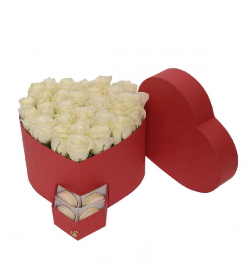 Saflığın simgesi 25 adet beyaz gül, tatlı 8 Fransız makaronu ile özenle yerleştirilmiş bu özel ürün, duygularınızı zarafetle ifade eder. Kalp şeklindeki kutusu ile unutulmaz bir sürpriz sunar.