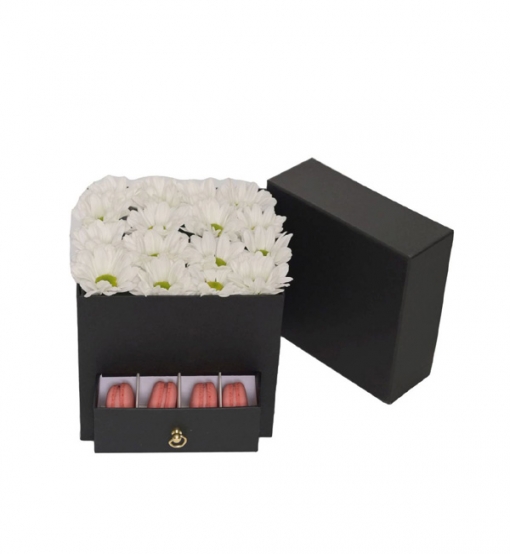 Sevdiklerinize hem görsel hem de lezzetli bir sürpriz yapmak istiyorsanız, Gemlik’te aynı gün teslimat seçeneğiyle sunulan bu şık kutu tam size göre! Kare kutu içerisinde zarif beyaz papatyalar ve rengarenk Fransız makaronlarıyla hazırlanan bu özel aranjman, doğum günü, yıldönümü, teşekkür ya da "seni seviyorum" demenin en tatlı yoludur.