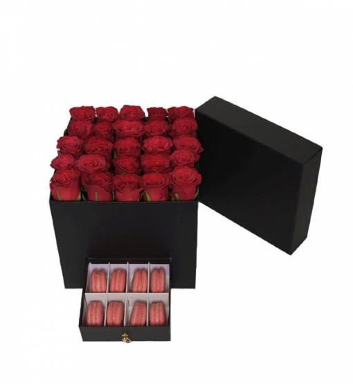 Aşkınızı en şık şekilde ifade edin! 25 adet taze kırmızı gül ve 8 adet lezzetli Fransız makaronu, çekmeceli siyah kutuda zarif bir şekilde sunuyoruz. Bu lüks hediye, hem romantik hem de görsel olarak etkileyici bir sürpriz arayanlar için mükemmel bir seçenek.