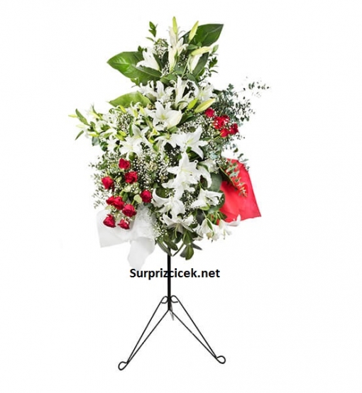 "Mutluluklar Ferforje Çiçek Aranjmanı, beyaz lilyum çiçeği ve kırmızı güllerin şık görüntüsü ile düğün, kutlama, açılış, tören gibi günlerde sevdiklerinizi kalbinde sizi eşsiz bir konuma çıkarmayı hedefliyor.