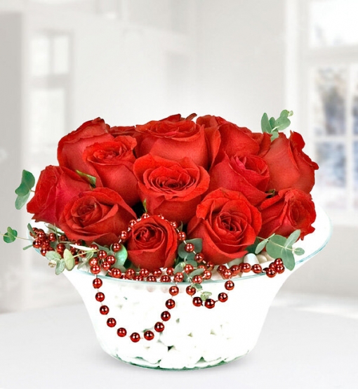 Kırmızı insanın adrenalini yükselttiği gibi kırmızının çiçek hali de çiçek gönderimi yapılacak kişinin adrenalini yükseltip heyecanlanmasına hepsinden öte mutlu olmasına sebep olur. 12 adet kırmızı gülün dekoratif malzemesi ve tasarımındaki boncukları ile dikkat çeken cam kase içindeki aranjmanı.