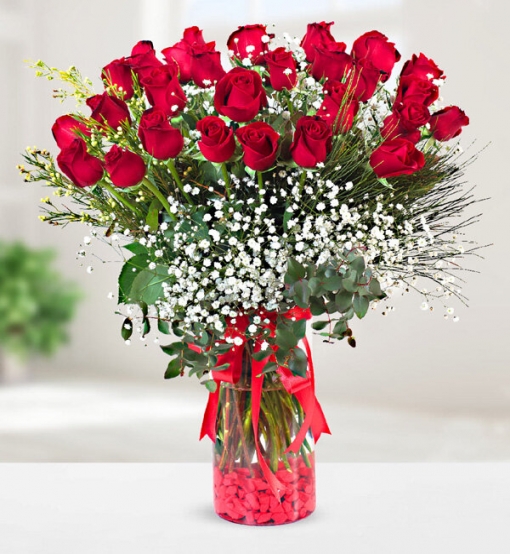 Sevmek, sevilmek ve tabii ki aşk! İnsana dair en bilinen ve milliyeti ne olursa olsun değişmeyen duygunun yani aşkın en güzel ifadesi, kırmızının görkemini ve cipsofilyaların tazeliğini aynı vazo içerisinde buluşturan kırmızı gül ile hazırlanmış vazo içerisinde gül aranjmanı.