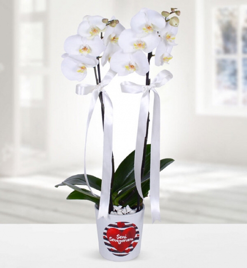 Seni Seviyorum Temalı Orkide Seni seviyorum temalı seramik saksı içerisinde çift dallı beyaz orkide ile hazırlanmıştır.