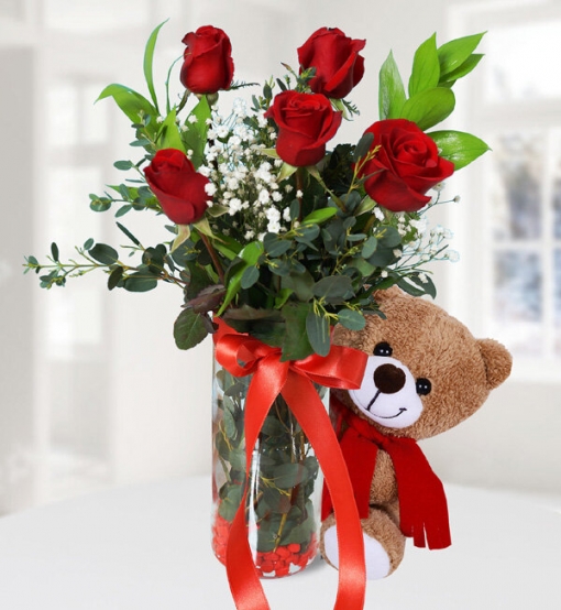 Vazoda 5 Kırmızı Gül Ayıcık Silindir cam vazo içerisinde kırmızı gül, cipsofilya ve peluş oyuncak ile hazırlanmıştır.