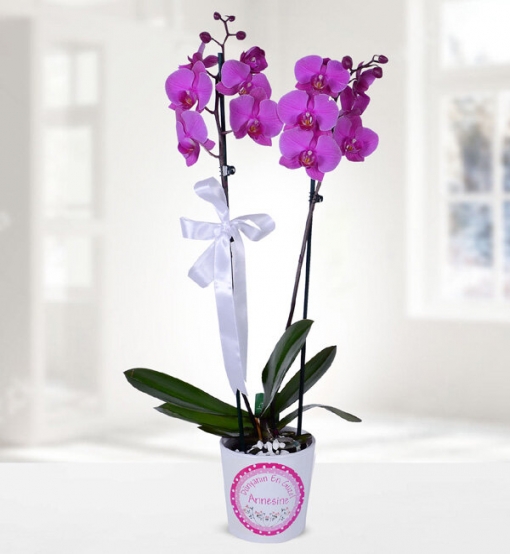 1. Sınıf ithal mor phalaenopsiz orkide kullanılmıştır. Çiçek yüksekliği yaklaşık 60 cm dir.