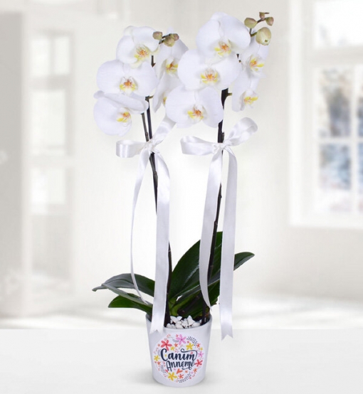 Zarif Çift Dallı Orkide Anneler günü temalı seramik saksı içerisinde 60 cm yüksekliğinde beyaz phalaenopsiz çift dallı orkide.