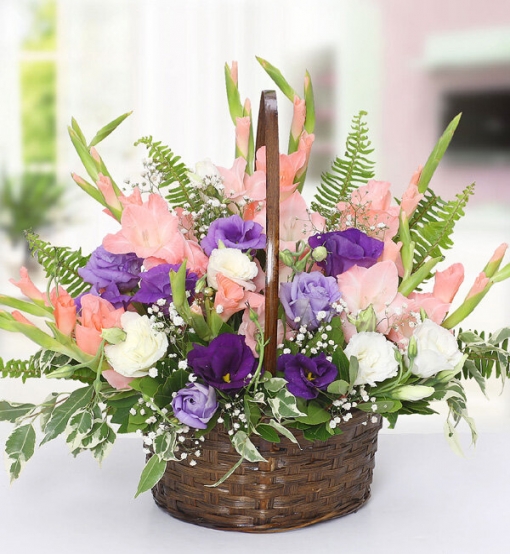 Sepet içinde karışık renkli çiçeklerle hazırlanmıştır.