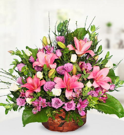 Lilyum Lisyantüs Sepeti Sepet içerisinde pembe lilyum, mor lisyantus ve beyaz gül ile hazırlanmıştır.
