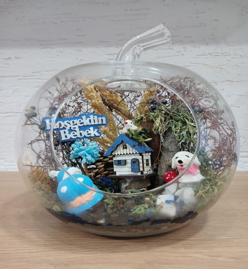 Orta boy fanus içerisine hazırladığımız tasarımımızda bir adet bebek ,Yapay bitkiler ve kurutulmuş bitkilerle dekore edilmiştir.