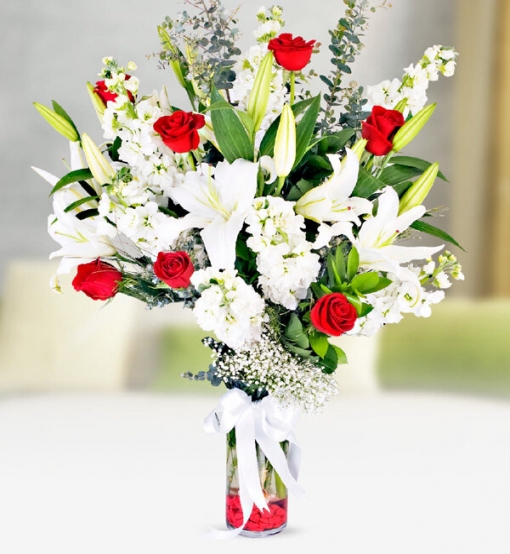 Vazo içinde çiçeklerin en iddialı türlerini bir araya getiren, cam ve çiçek birlikteliğinden hoşlananlar için beyaz kazablanka lilyum, beyaz şebboy ve kırmızı gülle hazırlanmış, cipsofilya ve yeşilliklerle zenginleştirilmiş şık aranjman. Not: Lilyumlar, mevsimsel şartlar nedeniyle kapalı olarak gönderilebilir. Kapalı lilyumlar oda sıcaklığında ve 1-2 gün içerisinde açmaktadır.