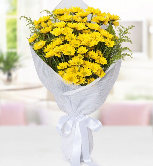 Sarı Papatya Buketi sarı papatya ve yeşillikler ile hazırlanmıştır.
