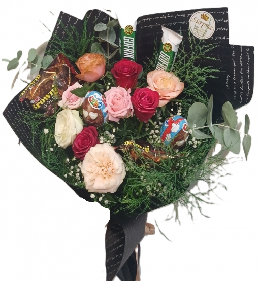 Sevdiklerinize hem tatlı hem de romantik bir sürpriz yapmak için tasarlanan bu özel buket, güller ve çikolataların eşsiz birleşimi ile hazırlanmıştır. Bukette; kırmızı ve pembe güller, zarif beyaz çiçekler, taze yeşillikler ile birlikte çikolata ve gofret çeşitleri bir araya getirilmiştir. Şık siyah kâğıt ambalajıyla sunulan bu ürün, doğum günü, sevgililer günü, yıldönümü, özel kutlamalar veya sürpriz hediyeler için en güzel tercihlerden biridir.