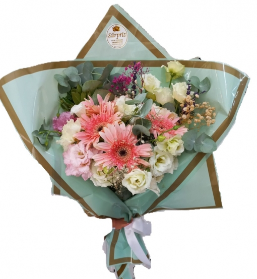 Gemlik'te çiçek siparişleriniz için doğru adres! Şık tasarımıyla göz kamaştıran, pembe gerberalar ve beyaz lisyantuslar gibi zarif çiçeklerin buluştuğu bu özel buket, sevdiklerinize unutulmaz bir hediye olacaktır. Birinci sınıf malzeme ve özenli işçilikle hazırlanmıştır.