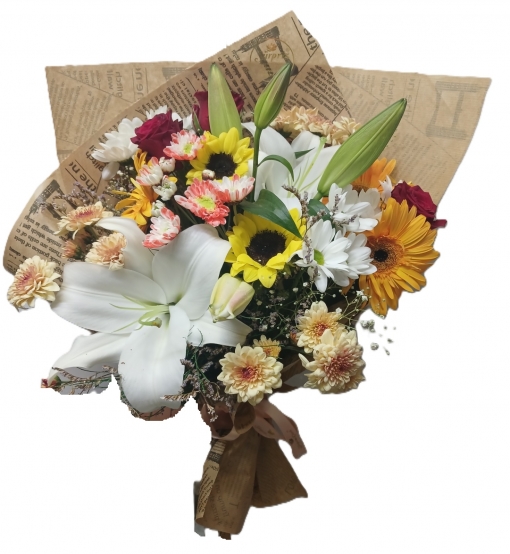 Bu özel karışık çiçek buketi, sevdiklerinize mutluluk ve renk katmak için özenle hazırlanmıştır. Bukette ayçiçeği, beyaz lilyum, gerbera, papatya, mevsim çiçekleri ve gül çeşitleri bir araya getirilerek şık bir ambalajla sunulmaktadır. Hem zarif hem de enerjik görünümüyle doğum günü, sevgililer günü, evlilik yıldönümü, özel kutlamalar ve tebrik amaçlı hediye edilebilecek en anlamlı çiçeklerdendir.