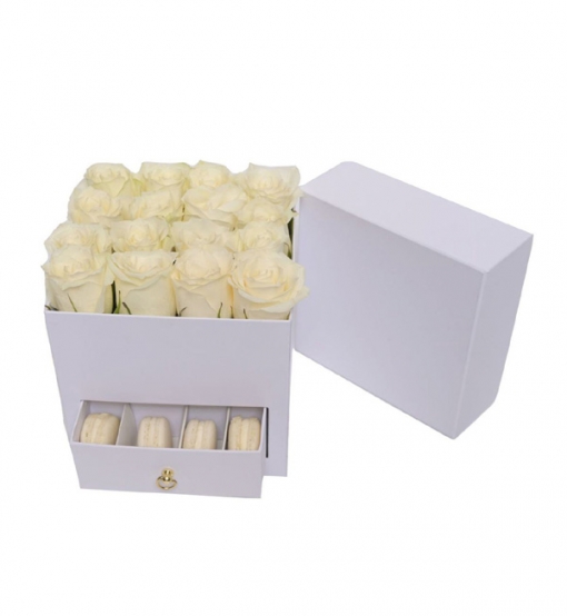 Eşsiz beyaz kutusu ile Beyaz Kutuda Güller Makaronlar aranjmanı, taze beyaz güllerden ve lezzetli taze makaronlarda oluşur. Tasarım kutu, yaklaşık olarak 16x18 cm boyutlarındadır.