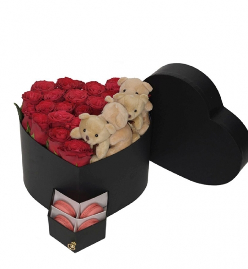 Sevdiğinize unutulmaz bir sürpriz yapmak istiyorsanız, bu zarif kutu tam size göre! Şık tasarımlı kutu içerisinde taptaze kırmızı güller, sevimli bir peluş ayıcık ve tatlı anlar için özel makaronlar yer alıyor. Her bir detay, sevgiyle seçildi ve özenle hazırlandı.