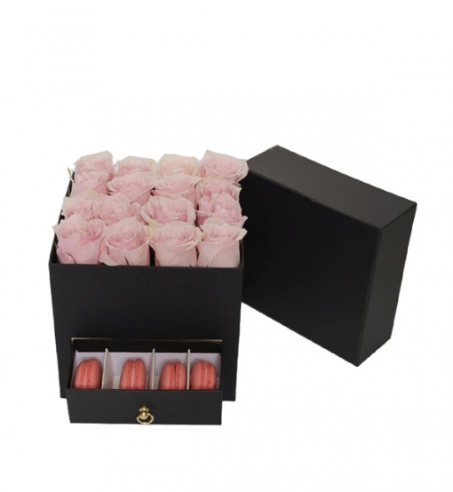 16 adet pembe gülün zarifliği ile 4 adet taptaze makaronun lezzeti, modern ve şık tasarımlı çekmeceli siyah kutu içerisinde birleşiyor. Hem göze hem damağa hitap eden bu özel aranjman, sevdiklerinizi mutlu etmenin en sofistike yollarından biri. Doğum günü, sevgililer günü, yıldönümü veya özel bir teşekkür hediyesi için mükemmeldir.