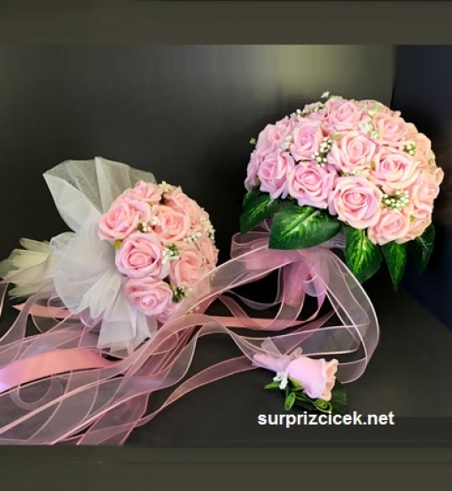 Pembe yapay güllerden gelin el buketi, atmalık yapay buket ve damat yaka çiçeği seti. İstediğiniz tek renk tonunda hazırlayabileceğimiz gelin aksesuar setinde gelinlerin en çok model arayışı yaaptığı aksesuarlar yer alıyor. Düğünün en güze seramonisi gelin çiçeği atmak için düşünülen buket diğerinden biraz daha küçük olarak hazırlanıyor. Gelin çiçeği seti siparişlerinizi tek tıkla internetten verdiğinizde adresinize gönderim yapabiliriz...Bursa dışına da kargo ile 1-3 iş günü içerisinde elinizde olacak şekilde adresinize ulaştırıyoruz