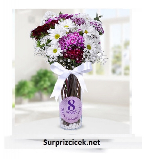 Kadınlar Günü temalı silindir vazo içerisinde 10 adet beyaz papatya, 10 adet hüsnüyusuf ve yeşillikler ile hazırlanmıştır.