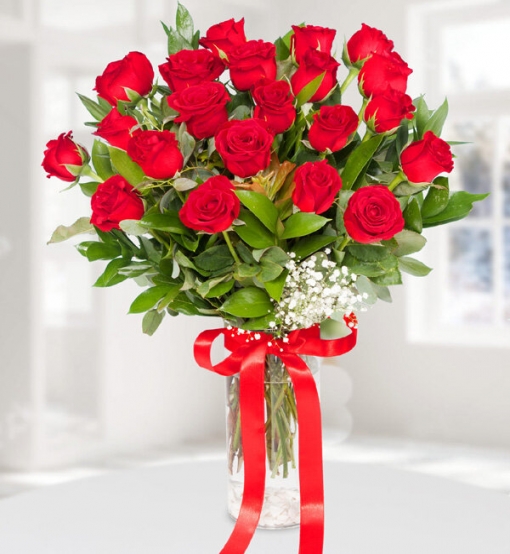 21 Kırmızı Gül Vazosu Silindir vazo içerisinde kırmızı gül ve cipsofilyalar ile hazırlanmıştır.