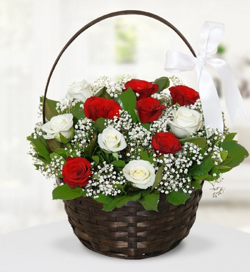 Çiçekli Gül Sepeti Sepet içerisinde kırmızı gül, beyaz gül, cipsofilya ve yeşillikler ile hazırlanmıştır.